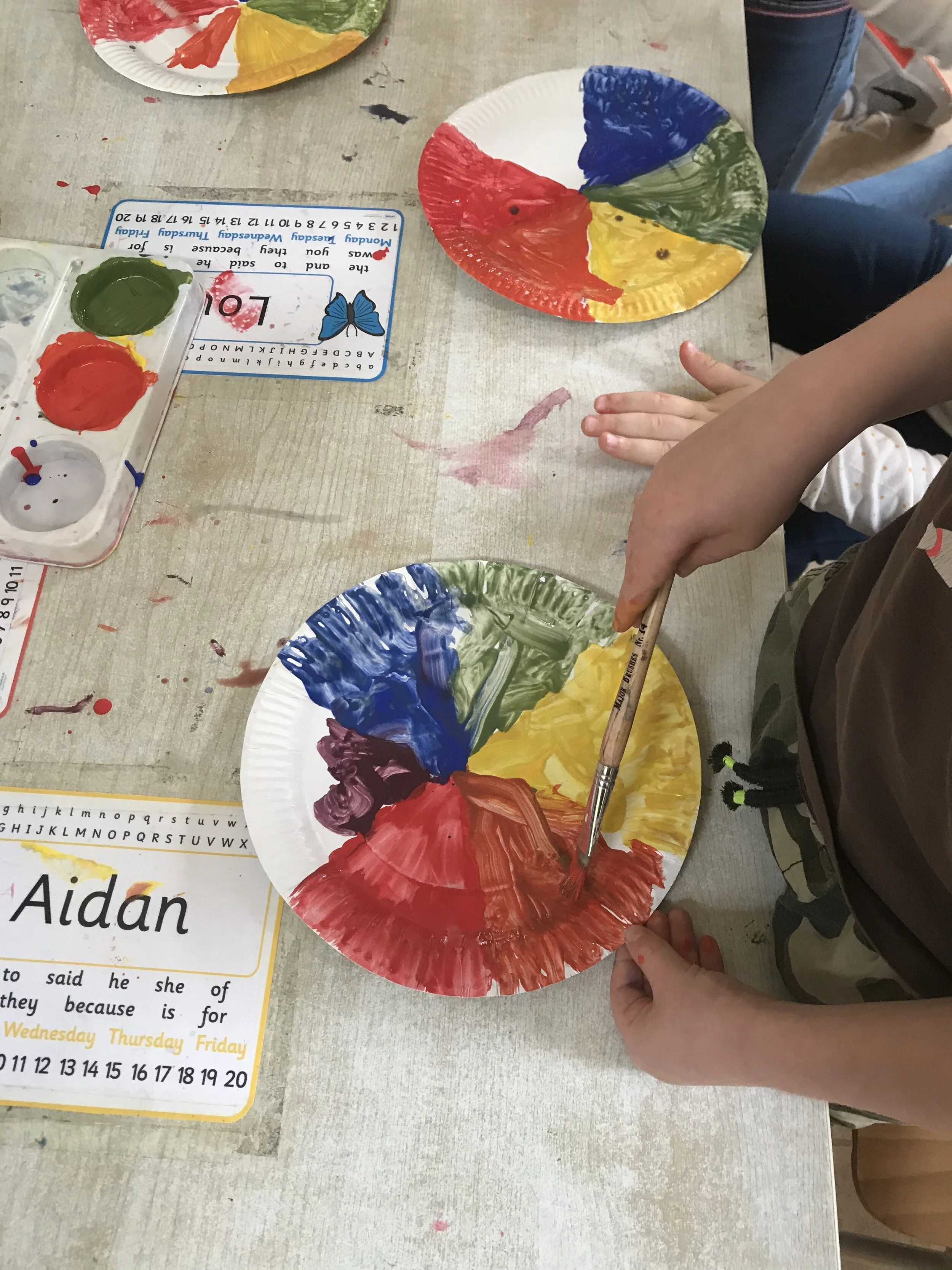 The Junior Infants have been exploring light and colour as part of their space topic. The have been looking at primary colours and how we use these colours to create new colours. We made colour wheels using our primary colours and mixing them to make secondary colours and put them together to make a cute display of our work!