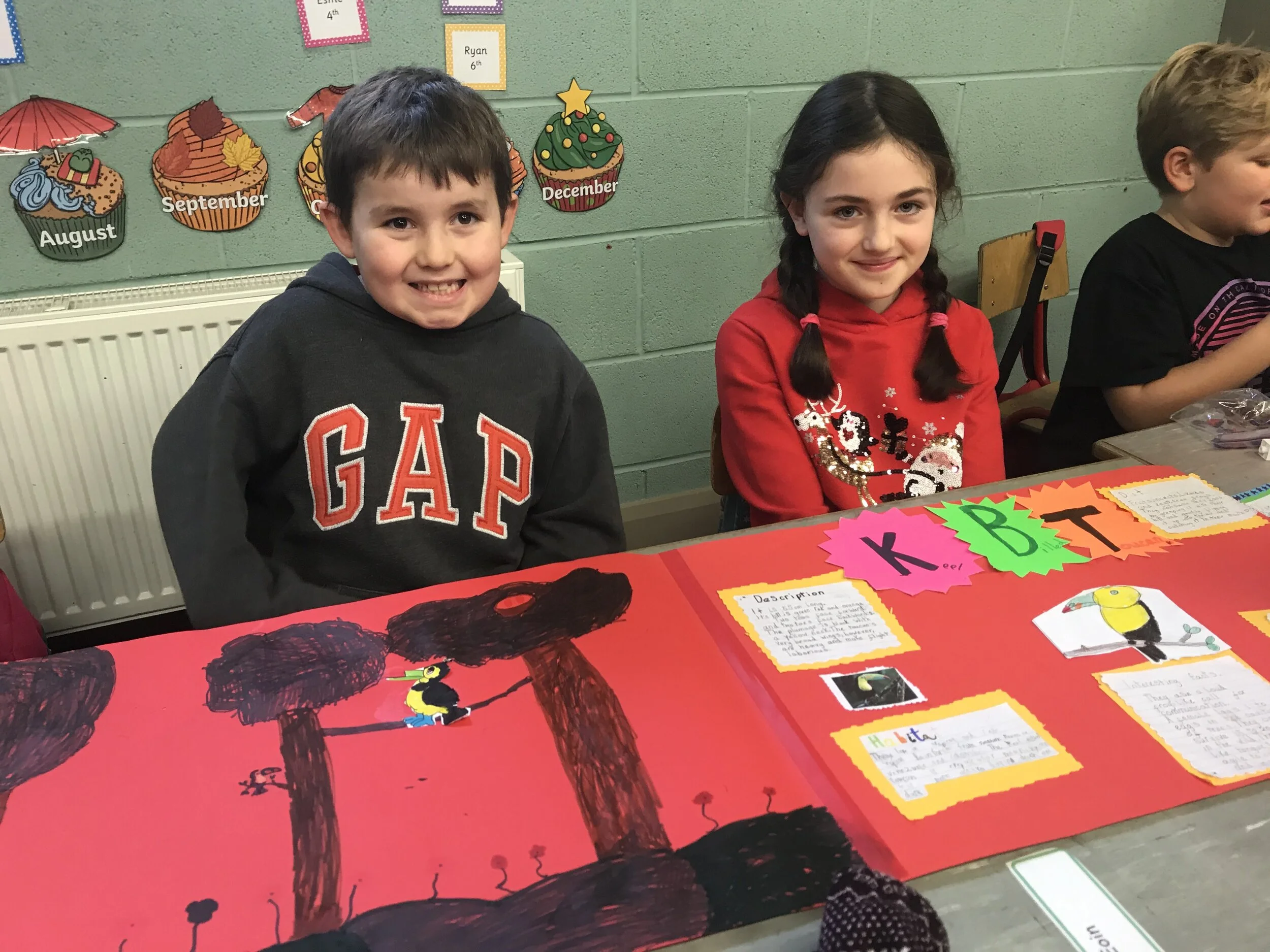 2nd class have been working hard over the last few weeks learning all about different rainforest animals. They put together information reports and created a class art project of a rainforest habitat. All the children and parents enjoyed an open afternoon in their classroom displaying all their hard work