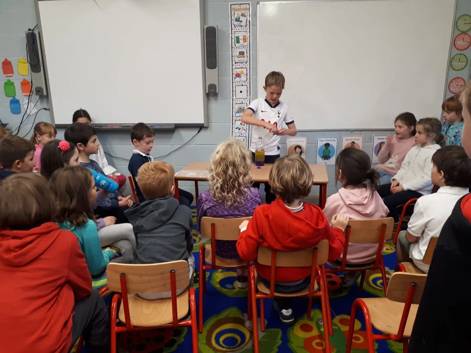 All this week, in celebration of science week, all children were working hard all week on a science experiment of their choice. The children got a chance at the end of the week to share their experiments with their friends. There were some explosions, including some unexpected ones, a few accidental spillages and numerous broken eggs throughout the day but the children did a great job at demonstrating their scientific knowledge! Well done to all the children for all their hard work and to all the teachers for their help with all the experiments throughout the day!